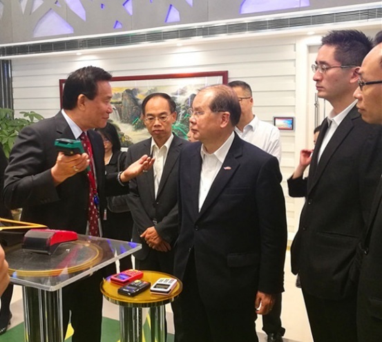 A staff member from the Kingtronics (Xiamen) Group introduces the company's latest products to Matthew Cheung Kin-chung, chief secretary for Administration of the HKSAR government. [Photo/fo.xm.gov.cn]