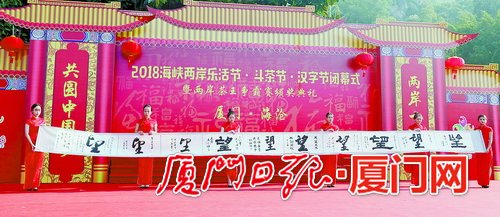 A scroll with "望" ("expectation" in English), the Chinese Character of the Year, written in different ways with Chinese writing brushes, is showcased at the closing ceremony of the 2018 Cross-Straits Happy Life Festival. [Photo/xmnn.cn]