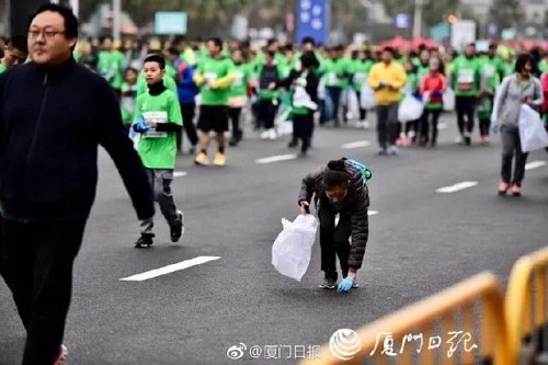 Volunteer families in green shirts for the 2019 Xiamen International Marathon pick up garbage along the route. [Photo/xmnn.cn]